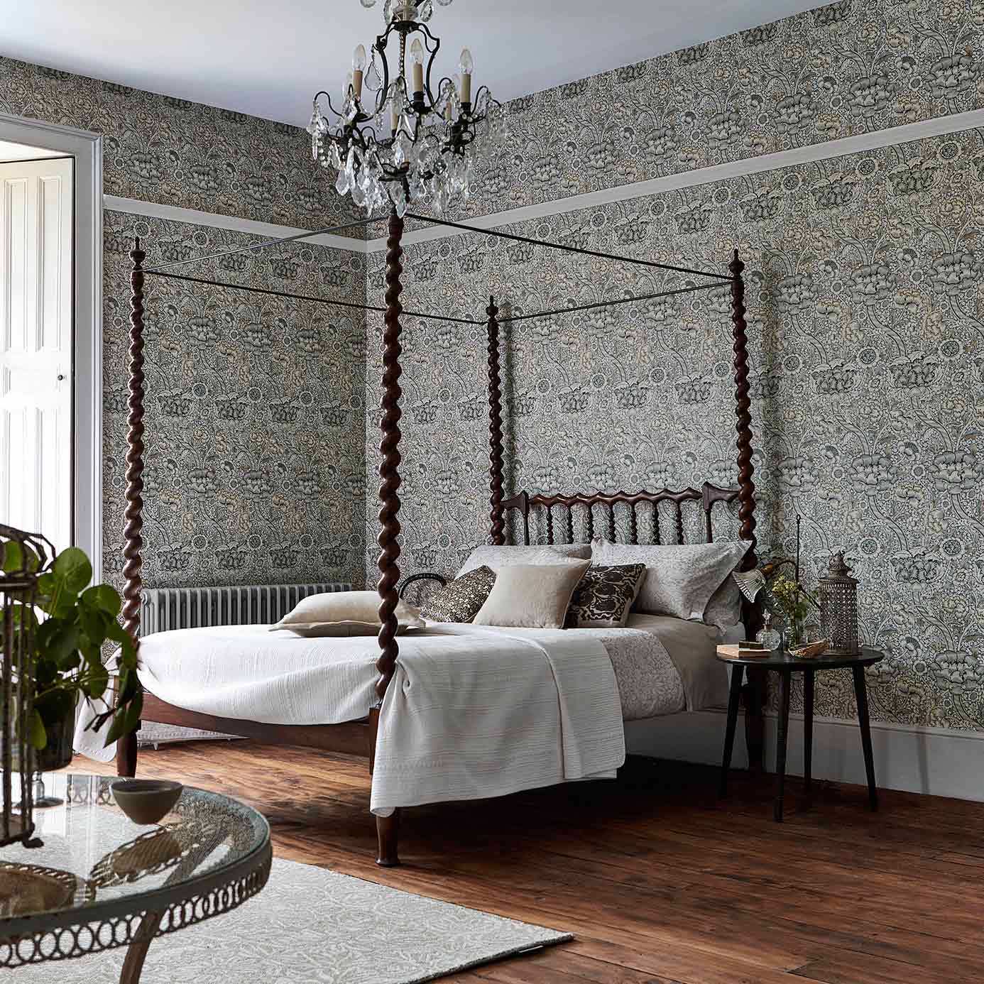 Wandle Wallpaper by Morris and Co was first produced in 1884 and features a distinctive diagonal branch with flowering detail. Originally requiring 32 printing blocks, the design is now available in a range of colourways suitable for use across all walls.