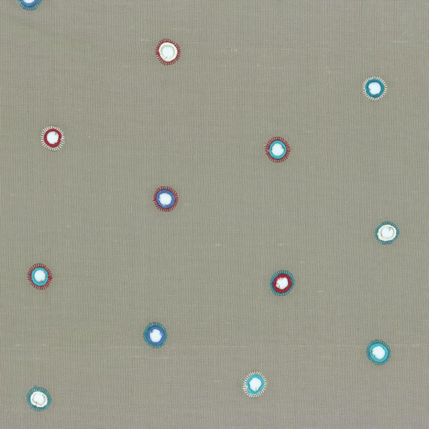 Embroidered silk curtain. Within the multicoloured embroidered motif, there are small holes that, like imaginary mirrors, recall a typical decoration of the Kutch region where small round mirrors are applied to fabrics by the skilled hands of local artisans. In Wedding Ring, an ethnic, traditional motif transforms into a contemporary geometry. Suitable for draping.
