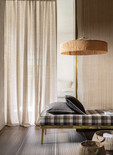 Linen warp and mixed linen and polyester weft with filament and staple fibres to give a balanced matte and lustrous finish.