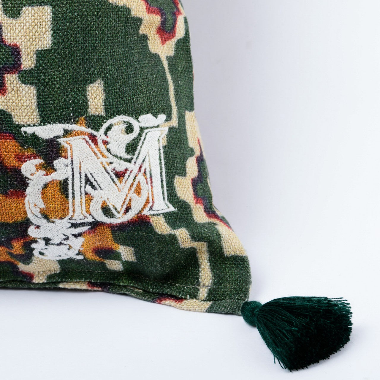 The genuinely flowery pattern with an eloquent Hungarian color palette makes this linen cushion the perfect statement piece. With soft geometrical shapes, it is hand-finished with green cotton tassels. Decorated with a white M letter monogram embroidered on the back and filled with 100% duck feathers filling.